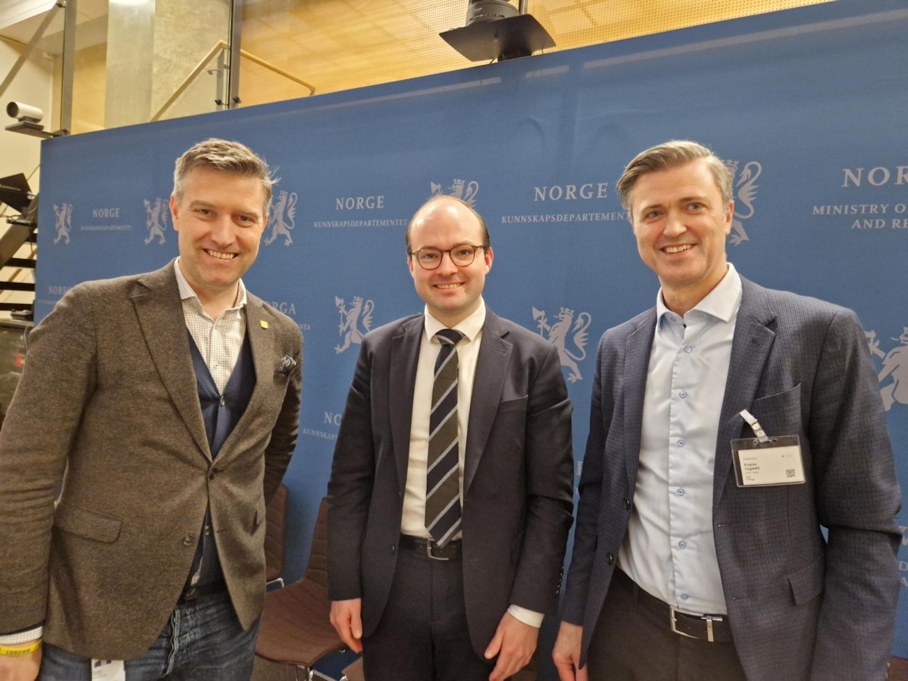 Fra venstre: Torbjørn Sølsnæs, bransjedirektør for barnehagebransjen, Statssekretær Sindre Lysø (Ap) og Ragnar Sagdahl, styreleder i barnehagebransjen. Foto: Tone Mila (NHO Geneo).