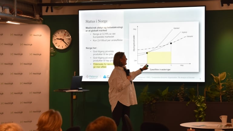 Hella Yngsdal, fagdirektør i Melanor, deltok med innlegg om hvordan medisinsk utstyr og helseteknologi anskaffes i dag, og hvordan det skaper utfordringer knyttet til skalering av innovative løsninger.